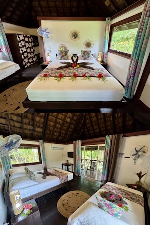 The Aute bungalow, the largest at the pension, can accommodate up to 10 guests across two floors. It features comfortable bedding and is furnished with coconut wood. Ideal for families or a stay with friends, it includes a bathroom with toilet and solar hot water, a living area, a desk, a wardrobe, a television, a fan, mosquito nets, a mini-refrigerator, and a covered terrace with outdoor seating.