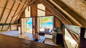 Located just in front of the lagoon, enjoy the view and beautiful colors of the Tuamotu every morning waking up. This unit is specially designed for a couple, featuring a canopy bed with a large mosquito net, an equipped kitchenette and a deck with long chairs.