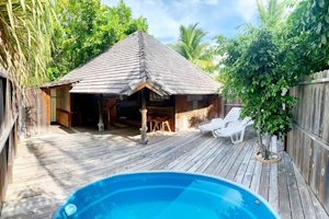 Only Garden side bungalow of the property but still only a few steps from the lagoon, this unit features a large private area with s small pool, deck and long chairs. It is perfect for a small family.